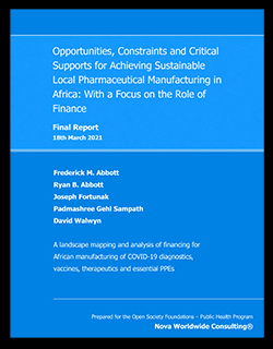 F. Abbott, R. Abbott, J. Fortunak, P. Gehl Sampath & D. Walwyn, Opportunities, Constraints and Critical Supports for Achieving Sustainable Local Pharmaceutical Manufacturing in Africa: With a Focus on the Role of Finance, Final Report, March 18, 2021 (Nova Worldwide), available at https://nova-worldwide.com/OSF-PHP_report; DOI: 10.33009/osf-php_report; DOI link: https://doi.org/10.33009/osf-php_report
